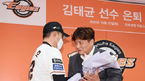 [OSEN=대전, 민경훈 기자] 한화 이글스의 프랜차이즈 스타 김태균이 22일 오후 한화생명이글스파크에서 은퇴 기자회견을 가졌다.김태균이 최원호 감독대행에게 꽃다발을 받고 있다./rumi@osen.co.kr