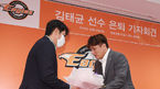 [OSEN=대전, 민경훈 기자] 한화 이글스의 프랜차이즈 스타 김태균이 22일 오후 한화생명이글스파크에서 은퇴 기자회견을 가졌다.김태균이 정민철 단장에게 꽃다발을 받고 있다./rumi@osen.co.kr