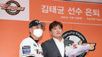 [OSEN=대전, 민경훈 기자] 한화 이글스의 프랜차이즈 스타 김태균이 22일 오후 한화생명이글스파크에서 은퇴 기자회견을 가졌다.김태균이 한화 주장 이용규에게 꽃다발을 받고 있다./rumi@osen.co.kr