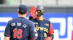 [OSEN=수원, 조은정 기자] 25일 오후 수원 KT위즈파크에서 '2020 신한은행 SOL KBO리그' KT 위즈와 롯데 자이언츠의 경기가 열렸다.5회초 롯데 선두타자 이병규가 우중월 솔로 홈런을 때려낸 뒤 오윤석의 환영을 받고 있다. /cej@osen.co.kr