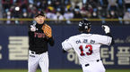 [OSEN=잠실, 곽영래 기자] 4일 오후 서울 잠실야구장에서 '2020 신한은행 SOL KBO리그' 준플레이오프 1차전 두산 베어스와 LG 트윈스의 경기가 열렸다.4회말 1사 만루 LG 정주현이 두산 페르난데스의 유격수 땅볼때 1루주자 허경민을 아