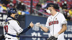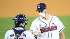 [OSEN=잠실, 곽영래 기자] 4일 오후 서울 잠실야구장에서 '2020 신한은행 SOL KBO리그' 준플레이오프 1차전 두산 베어스와 LG 트윈스의 경기가 열렸다.시구를 마친 니퍼트가 박세혁과 주먹인사를 하고 있다. /youngrae@osen.co.kr