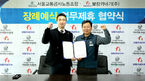[사진]김경곤 보람카네기㈜ 영업이사(왼쪽)와 김대훈 서울교통공사노동조합 위원장(오른쪽)이협약 체결 후 기념 사진을 촬영하고 있다.▲ 서울교통공사노동조합원 대상 상조 서비스 이용 특전 제공하며 복지 향상 도와▲ 임산