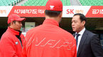 [OSEN=인천, 곽영래 기자] 9일 오후 인천 SK행복드림구장에서 SK 와이번스 마무리훈련이 진행됐다.김원형 신임 감독이 주장이였던 최정과 인사를 나누고 있다. /youngrae@osen.co.kr