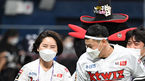 [OSEN=고척, 이대선 기자] 10일 오후 서울 고척스카이돔에서 '2020 신한은행 SOL KBO리그' 플레이오프 KT 위즈와 두산 베어스의 경기가 열렸다.경기에 앞서 시타와 시구를 마친 KT 박수미 장내 아나운서와 김주일 응원단장이 경기장을