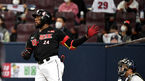[OSEN=고척, 최규한 기자] 13일 오후 서울 고척 스카이돔에서 ‘2020 신한은행 SOL KBO리그’ 플레이오프 4차전 두산 베어스와 KT 위즈의 경기가 열렸다.1회초 무사 1, 2루 상황 KT 로하스가 우중간2루타를 날리고 있다. / dreamer@osen.