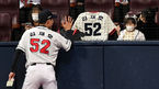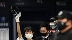 [OSEN=고척, 최규한 기자] 13일 오후 서울 고척 스카이돔에서 ‘2020 신한은행 SOL KBO리그’ 플레이오프 4차전 두산 베어스와 KT 위즈의 경기가 열렸다.경기 시작을 앞두고 두산 김재호가 아내와 딸에게 인사를 하고 있다. / drea
