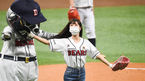 [OSEN=고척, 박준형 기자] 13일 오후 서울 고척스카이돔에서 '2020 신한은행 SOL KBO리그' 플레이오프 4차전 두산 베어스와 KT 위즈의 경기가 열렸다.경기에 앞서 오마이걸 유아가 시구를 하고 있다 ./ soul1014@osen.co.kr