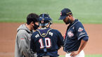[OSEN=박준형 기자] 17일 오후 서울 고척스카이돔에서 ‘2020 신한은행 SOL KBO리그’ 한국시리즈 1차전 NC 다이노스와 두산 베어스의 경기가 열렸다.1회말 1실점 허용한 두산 선발투수 알칸타라가 박세혁 포수와 이야기를 나누