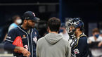 [OSEN=고척, 이대선 기자] 17일 오후 서울 고척스카이돔에서 '2020 신한은행 SOL KBO리그' 한국시리즈 1차전 NC 다이노스와 두산 베어스의 경기가 열렸다.1회말 1사 1,2루에서 마운드를 방문한 두산 박세혁이 알칸타라와 이야기를 나누