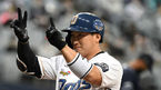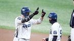 [OSEN=박준형 기자] 17일 오후 서울 고척스카이돔에서 ‘2020 신한은행 SOL KBO리그’ 한국시리즈 1차전 NC 다이노스와 두산 베어스의 경기가 열렸다.1회말 NC 선두타자 박민우가 2루타를 날린뒤 세리머니를 하고 있다 . / soul1014@
