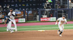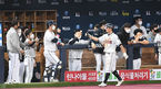 [OSEN=고척, 곽영래 기자] 20일 오후 서울 고척스카이돔에서 '2020 신한은행 SOL KBO리그' 한국시리즈 3차전 두산 베어스와 NC 다이노스의 경기가 열렸다.5회말 2사 3루 두산 정수빈이 노진혁의 실책으로 득점을 올린 뒤 동료들과 기뻐