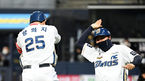 [OSEN=고척, 이대선 기자] 23일 오후 서울 고척스카이돔에서 '2020 신한은행 SOL KBO리그' 한국시리즈 5차전 NC 다이노스와 두산 베어스의 경기가 열렸다.6회말 1사 1루에서 NC 양의지가 중월 투런 홈런을 치고 진종길 코치와 환호하고