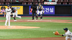 [OSEN=고척, 지형준 기자] 24일 오후 서울 고척스카이돔에서 ‘2020 신한은행 SOL KBO리그’ 포스트시즌 한국시리즈 6차전 NC 다이노스와 두산 베어스의 경기가 열렸다.7회초 1사 2,3루에서 두산이 김재환의 2루땅볼로 26이닝 만에