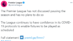 [OSEN=이인환 기자] 잉글랜드 프리미어리그(EPL) 사무국이 이번 시즌 코로나로 인한 중단은 없을 것이라는 입장을 밝혔다.EPL 사무국은 31일(한국시간) "2020-2021 시즌 리그 중단에 대해 논의하지도 않았고 그럴 계획도 없다"라