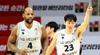 [OSEN=안양, 김성락 기자] 3일 오후 경기도 안양시 비산동 안양실내체육관에서 ‘2020~2021 현대모비스 프로농구’ 안양 KGC와 창원 LG의 경기가 열렸다.3쿼터 LG 최승욱이 김시래의 3점슛에 기뻐하고 있다./ksl0919@osen.co.kr