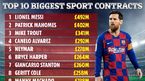 [OSEN=이균재 기자]축구신 리오넬 메시(바르셀로나)의 계약 총액은 상상을 초월했다.영국 매체 더선은 1일(한국시간) 스페인 엘문도의 보도를 인용해 스포츠 역사상 최고액 계약 톱10을 공개했다.메시는 압도적인 1위를 차지했다.