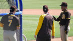 OSEN=피오리아(미 애리조나주), 이사부 통신원] 샌디에이고 파드레스의 공식 훈련이 24일(한국시간) 진행됐다.타격훈련을 하던 김하성이 캄푸사노와 이야기를 나누고 있다. /lsboo@osen.co.kr