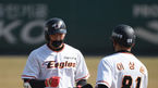 [OSEN=대전, 조은정 기자] 5일 대전 중구 한화생명이글스파크에서 키움 히어로즈와 한화 이글스의 연습 경기가 열렸다.4회말 1사 1,2루 한화 정은원이 2타점 2루타를 때려낸 뒤 이상훈 코치와 주먹을 치고 있다. /cej@osen.co.kr