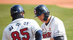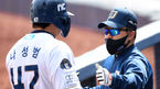 [OSEN=잠실,박준형 기자] 21일 오후 서울 잠실구장에서 2021년 KBO리그 두산 베어스와 KT위즈의 시범경기가 진행됐다.7회말 2사 두산 박계범이 안타를 날리고 김주찬 코치와 하이파이브를 하고 있다. / soul1014@osen.co.kr