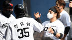 [OSEN=창원, 이대선 기자] 21일 창원NC파크에서 2021년 KBO리그 NC 다이노스와 SSG 랜더스의 시범경기가 열렸다.4회초 1사에서 SSG 한유섬이 중전 안타를 치고 조동화 코치와 주먹을 맞대고 있다. /sunday@osen.co.kr