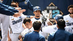 [OSEN=창원, 이대선 기자] 21일 창원NC파크에서 2021년 KBO리그 NC 다이노스와 SSG 랜더스의 시범경기가 열렸다.1회초 1사 1,3루에서 NC 알테어의 희생플라이 때 홈을 밟은 나성범이 더그아웃에서 동료들의 축하를 받고 있다. /sunday@osen.c