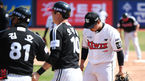 [OSEN=수원,박준형 기자] 22일 오후 경기도 수원시 수원kt위즈파크에스 2021시즌 프로야구 kt 위즈와 LG 트윈스의 시범경기가 진행됐다.3회초 이닝종료 후 1실점하며 동점 허용한 KT 안영명이 실책 기록한 강백호의 사과에 미소 짓고