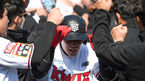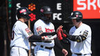 [OSEN=수원,박준형 기자] 22일 오후 경기도 수원시 수원kt위즈파크에스 2021시즌 프로야구 kt 위즈와 LG 트윈스의 시범경기가 진행됐다.3회말 1사 만루 KT 이홍구가 재역전 만루홈런을 날리고 동료들의 축하를 받고 있다. / soul1014@osen.