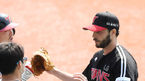 [OSEN=인천,박준형 기자] 25일 오후 인천 SSG랜더스필드에서 진행된 2021시즌 프로야구 SSG 랜더스와 삼성 라이온즈의 시범경기가 진행됐다.2회초 1사 2루 SSG 박종훈이 삼성 김상수의 내야뜬공을 잡아준 로맥에게 고마움을 표시하고