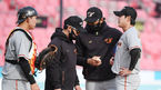 [OSEN=수원,박준형 기자] 26일 오후 수원kt위즈파크에서 2021시즌 프로야구 kt 위즈와 한화 이글스의 시범경기가 진행됐다.9회말 1사 만루 한화 호세 로사도 코치가 마운드에 올라 윤대경과 이야기를 나누고 있다. / soul1014@osen.co.kr