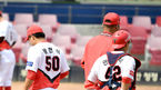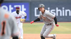 [OSEN=수원,박준형 기자] 26일 오후 수원kt위즈파크에서 2021시즌 프로야구 kt 위즈와 한화 이글스의 시범경기가 진행됐다.4회초 1사 1,3루 한화 정진호가 선취 1타점 적시타를 날리고 런다운 걸리고 있다./ soul1014@osen.co.kr