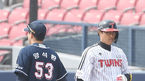 [OSEN=잠실, 곽영래 기자] 26일 오후 서울 잠실야구장에서 LG 트윈스와 두산 베어스의 시범경기가 열렸다.1회말 2사 1루 LG 채은성이 안타를 때린 뒤 1루에서 두산 양석환과 인사를 나누고 있다. /youngrae@osen.co.kr