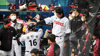 [OSEN=잠실, 지형준 기자] 28일 오후 서울 잠실구장에서 2021 KBO리그 시범경기 LG 트윈스와 삼성 라이온즈의 경기가 열렸다.5회말 1사에서 역전 솔로포를 날린 LG 김민성이 홈을 밟으며 삼성 강민호와 이야기를 나누고 있다. /jpnews@osen