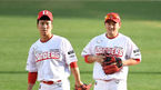 [OSEN=인천, 이대선 기자] 1일 오후 SSG 랜더스가 인천 SSG랜더스필드에서 새 유니폼을 입고 훈련을 진행했다.SSG 정현과 최주환이 수비 훈련을 하고 있다. /sunday@osen.co.kr