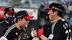 [OSEN=수원, 지형준 기자] 8일 오후 수원 KT위즈파크에서 ‘2021 신한은행 SOL KBO리그’ KT 위즈와 LG 트윈스의 경기가 열렸다.3회말 2사 1,2루에서 LG 김윤식이 KT 박경수를 삼진 처리하고 김현수와 기뻐하고 있다. /jpnews@osen.co.kr