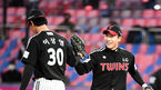 [OSEN=수원, 지형준 기자] 8일 오후 수원 KT위즈파크에서 ‘2021 신한은행 SOL KBO리그’ KT 위즈와 LG 트윈스의 경기가 열렸다.1회말1사 1,2루에서 LG 이주형이 KT 강백호를 병살로 처리하며 이상영과 기뻐하고 있다. /jpnews@osen.co.kr