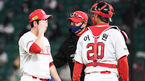[OSEN=인천,박준형 기자] 14일 오후 인천SSG랜더스필드에서 2021 신한은행 SOL KBO리그 SSG 랜더스와 NC 다이노스의 경기가 진행됐다.5회초 1사 2루 NC 도태훈의 타석때 SSG 조웅천 투수 코치가 마운드에 올라 문승원 선발투수와 이야기를