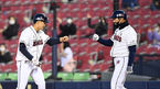 [OSEN=잠실, 곽영래 기자] 14일 서울 잠실야구장에서 ‘2021 신한은행 SOL KBO 리그’ 두산 베어스와 KT 위즈의 경기가 열렸다.2회말 1사 1,2루 두산 박계범이 적시타를 때린 뒤 김주찬 코치와 주먹 세레머니를 하고 있다. /youngrae@o