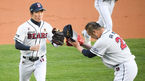 [OSEN=잠실,박준형 기자] 15일 오후 서울 잠실구장에서 ‘2021 신한은행 SOL KBO 리그’ 두산 베어스와 KT 위즈의 경기가 진행된다.1회초 호수비로 병살아웃시킨 허경민이 유희관에게 감사의 인사를 받으며 더그아웃으로 들어