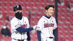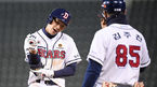 [OSEN=잠실,박준형 기자] 15일 오후 서울 잠실구장에서 ‘2021 신한은행 SOL KBO 리그’ 두산 베어스와 KT 위즈의 경기가 진행된다.7회말 이닝종료 후 데뷔 첫 안타를 신고한 두산 안재석이 고영민 3루 코치의 축하를 받고 미소