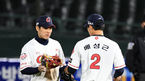 [OSEN=부산, 이대선 기자] 17일 오후 부산 사직야구장에서 ’2021 신한은행 SOL KBO 리그' 롯데 자이언츠와 삼성 라이온즈의 경기가 열렸다.9회초 1사 1,2루에서 롯데 마차도가 마운드를 내려온 배성근의 투구자세를 따라하고 있다.