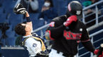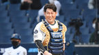 [OSEN=창원,박준형 기자] 20일 오후 창원NC파크에서 '2021 신한은행 SOL KBO 리그' NC 다이노스와 KT 위즈의 경기가 진행됐다.1회초 1사 만루 KT 알몬테의 내야뜬공 타구를 양의지 포수가 잡아낸뒤 3루 주자 황재균 향해 미소 짓고 있다./