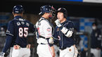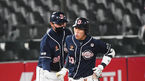 [OSEN=부산,박준형 기자] 21일 오후 부산사직구장에서 '2021 신한은행 SOL KBO 리그' 롯데 자이언츠와 두산 베어스의 경기가 진행됐다.7회초 1사 두산 허경민이 솔로홈런을 날리고 김주찬 1루 코치와 하이파이브를 하고 있다. / soul1014@o