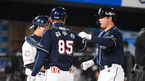 [OSEN=부산,박준형 기자] 21일 오후 부산사직구장에서 '2021 신한은행 SOL KBO 리그' 롯데 자이언츠와 두산 베어스의 경기가 진행됐다.4회초 무사 1루 두산 김재환이 선취 2점 홈런을 날리고 김주찬 1루코치와 하이파이브를 하고 있다