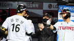 [OSEN=잠실, 지형준 기자] 22일 오후 서울 잠실야구장에서 ‘2021 신한은행 SOL KBO리그’ LG 트윈스와 KIA 타이거즈의 경기가 열렸다.7회말 2사에서 LG 김민성이 좌월 솔로포를 날리고 더그아웃에서 김현수와 시계 세리머니를 하