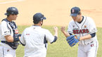 [OSEN=이천, 곽영래 기자] 22일 경기도 이천시 두산베어스파크에서 '2021 KBO 퓨처스리그' 두산 베어스와 삼성 라이온즈의 경기가 열렸다.6회초 1사 1루 두산 곽빈이 권명철 코치와 주먹 세레머니를 하며 마운드를 내려오고 있다. /you