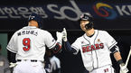 [OSEN=잠실, 이대선 기자] 23일 오후 서울 잠실야구장에서 ’2021 신한은행 SOL KBO 리그' 두산 베어스와 NC 다이노스의 경기가 열렸다.3회말 무사에서 두산 페르난데스가 우월 솔로 홈런을 치고 홈에서 박건우의 축하를 받고 있다.