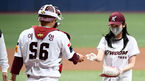 [OSEN=고척, 김성락 기자] 25일 오후 서울 고척스카이돔에서 '2021 신한은행 SOL KBO리그' 키움 히어로즈와 SSG 랜더스의 경기가 열렸다.경기에 앞서 하트시그널 박지현이 시구를 마친 뒤 키움 이지영과 인사를 나누고 있다./ksl0919@osen.