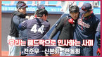 [OSEN=수원, 최규한 기자] KT 신본기가 친근함(?) 넘치는 헤드락 인사로 친정 롯데와 인사했다.25일 오후 수원 KT위즈파크에서 열리는 ‘2021 신한은행 SOL KBO리그’ KT 위즈와 롯데 자이언츠의 경기, 홈 팀 훈련을 마친 KT 신본기