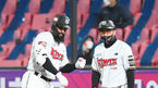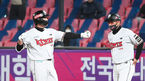 [OSEN=수원,박준형 기자] 30일 오후 수원KT위즈파크에서 2021 신한은행 SOL KBO리그 KT 위즈와 KIA 타이거즈의 경기가 진행됐다.6회말 1사 1,2루 KT 알몬테가 1타점 적시타를 날리고 박정환 1루 코치와 하이파이브를 하고 있다. / soul1014@ose